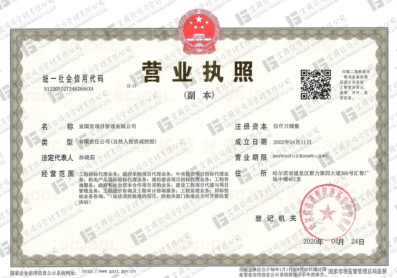 宜國(guó)發(fā)項(xiàng)目管理有限公司(原名黑龍江國(guó)發(fā)項(xiàng)目管理有限責(zé)任公司)成立于2002年4月,公司注冊(cè)資金5000萬(wàn)元人民幣,具有獨(dú)立法人資格?,F(xiàn)具備國(guó)家住房和城鄉(xiāng)建設(shè)部頒發(fā)的工程招標(biāo)代理機(jī)構(gòu)甲級(jí)資質(zhì),發(fā)展和改革委員會(huì)頒發(fā)的中央投資項(xiàng)目招標(biāo)代理機(jī)構(gòu)甲級(jí)資質(zhì)、財(cái)政部頒發(fā)的政府采購(gòu)代理機(jī)構(gòu)甲級(jí)資質(zhì),黑龍江省住房和城鄉(xiāng)建設(shè)廳頒發(fā)的工程造價(jià)咨詢(xún)企業(yè)甲級(jí)資質(zhì),并已納入全國(guó)投資項(xiàng)目在線(xiàn)審批監(jiān)管平臺(tái)工程咨詢(xún)單位備案名單、“中國(guó)政府采購(gòu)網(wǎng)”政府采購(gòu)代理機(jī)構(gòu)名單及“中國(guó)國(guó)際招標(biāo)網(wǎng)”機(jī)電產(chǎn)品國(guó)際招標(biāo)代理機(jī)構(gòu)名單,且通過(guò)了質(zhì)量管理體系、環(huán)境管理體系、職業(yè)健康安全管理體系認(rèn)證。