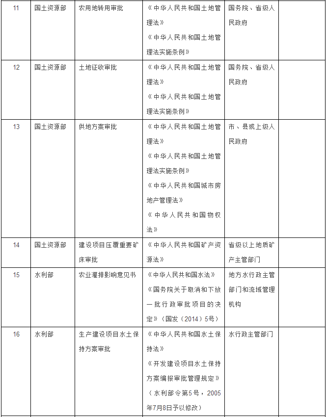 國土資源部門4項(xiàng):農(nóng)用地轉(zhuǎn)用審批、土地征收審批、供地方案審批、建設(shè)項(xiàng)目壓覆重要礦床審批。