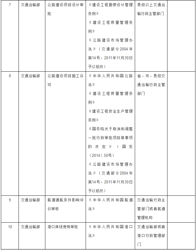 交通運(yùn)輸部門5項(xiàng):水運(yùn)工程設(shè)計(jì)文件審查、公路建設(shè)項(xiàng)目設(shè)計(jì)審批、公路建設(shè)項(xiàng)目施工許可、航道通航條件影響評(píng)價(jià)審核、港口岸線使用審批。