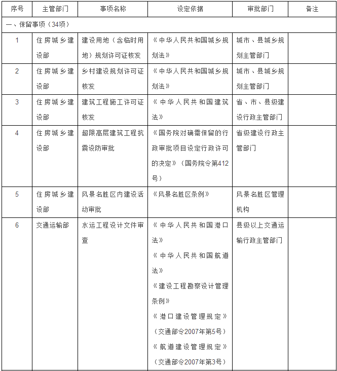 住房城鄉(xiāng)建設(shè)部門5項(xiàng):建設(shè)用地(含臨時(shí)用地)規(guī)劃許可證核發(fā)、鄉(xiāng)村建設(shè)規(guī)劃許可證核發(fā)、建筑工程施工許可證核發(fā)、超限高層建筑工程抗震設(shè)防審批、風(fēng)景名勝區(qū)內(nèi)建設(shè)活動(dòng)審批。