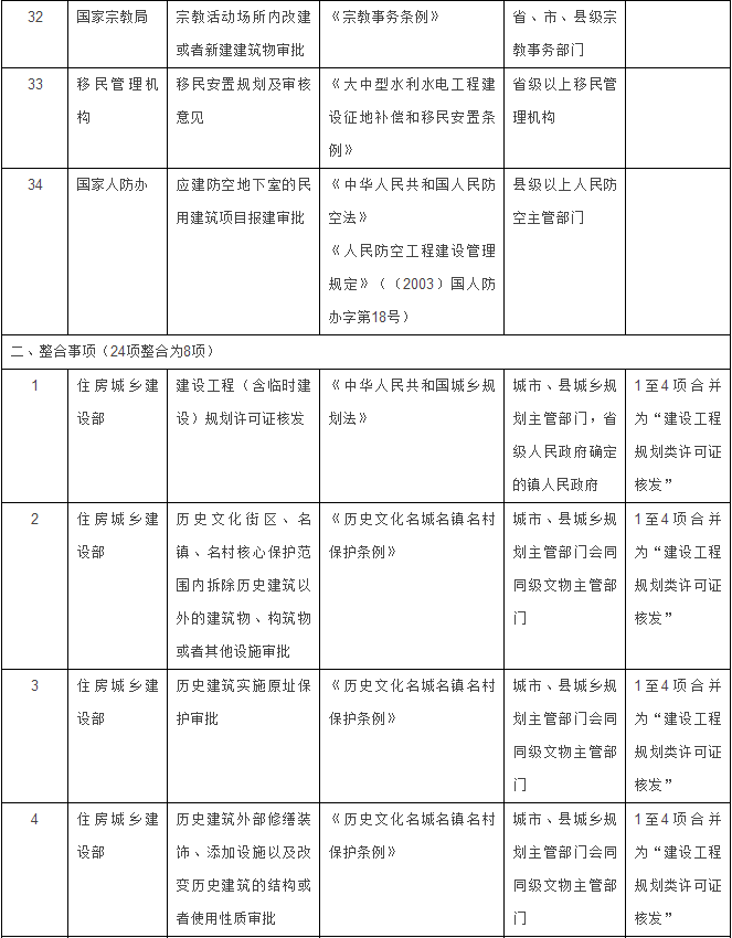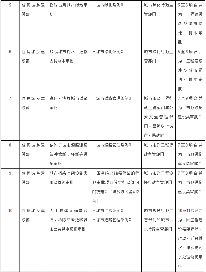 住房城鄉(xiāng)建設(shè)部門11項(xiàng)整合為4項(xiàng):一是將“建設(shè)工程(含臨時(shí)建設(shè))規(guī)劃許可證核發(fā)”、“歷史文化街區(qū)、名鎮(zhèn)、名村核心保護(hù)范圍內(nèi)拆除歷史建筑以外的建筑物、構(gòu)筑物或者其他設(shè)施審批”、“歷史建筑實(shí)施原址保護(hù)審批”、“歷史建筑外部修繕裝飾、添加設(shè)施以及改變歷史建筑的結(jié)構(gòu)或者使用性質(zhì)審批”4項(xiàng),合并為“建設(shè)工程規(guī)劃類許可證核發(fā)”1項(xiàng);二是將“臨時(shí)占用城市綠地審批”、“砍伐城市樹木、遷移古樹名木審批”2項(xiàng),合并為“工程建設(shè)涉及城市綠地、樹木審批”1項(xiàng);三是將“占用、挖掘城市道路審批”、“依附于城市道路建設(shè)各種管線、桿線等設(shè)施審批”、“城市橋梁上架設(shè)各類市政管線審批”3項(xiàng),合并為“市政設(shè)施建設(shè)類審批”1項(xiàng);四是將“因工程建設(shè)確需改裝、拆除或者遷移城市公共供水設(shè)施審批”、“拆除、移動(dòng)城鎮(zhèn)排水與污水處理設(shè)施方案審核”2項(xiàng),合并為“因工程建設(shè)需要拆除、改動(dòng)、遷移供水、排水與污水處理設(shè)施審核”1項(xiàng)。