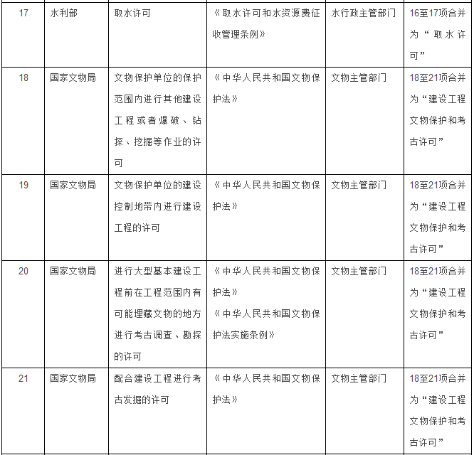 文物部門4項(xiàng)整合為1項(xiàng):將“文物保護(hù)單位的保護(hù)范圍內(nèi)進(jìn)行其他建設(shè)工程或者爆破、鉆探、挖掘等作業(yè)的許可”、“文物保護(hù)單位的建設(shè)控制地帶內(nèi)進(jìn)行建設(shè)工程的許可”、“進(jìn)行大型基本建設(shè)工程前在工程范圍內(nèi)有可能埋藏文物的地方進(jìn)行考古調(diào)查、勘探的許可”、“配合建設(shè)工程進(jìn)行考古發(fā)掘的許可”4項(xiàng),合并為“建設(shè)工程文物保護(hù)和考古許可”1項(xiàng)。