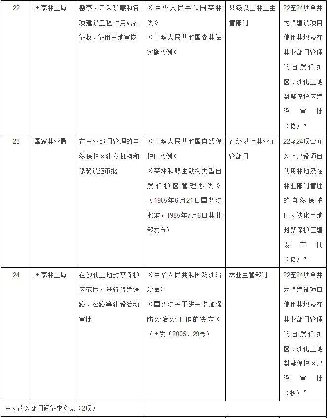 林業(yè)部門3項(xiàng)整合為1項(xiàng):將“勘察、開采礦藏和各項(xiàng)建設(shè)工程占用或者征收、征用林地審核”、“在林業(yè)部門管理的自然保護(hù)區(qū)建立機(jī)構(gòu)和修筑設(shè)施審批”、“在沙化土地封禁保護(hù)區(qū)范圍內(nèi)進(jìn)行修建鐵路、公路等建設(shè)活動(dòng)審批”3項(xiàng),合并為“建設(shè)項(xiàng)目使用林地及在林業(yè)部門管理的自然保護(hù)區(qū)、沙化土地封禁保護(hù)區(qū)建設(shè)審批(核)”1項(xiàng)。