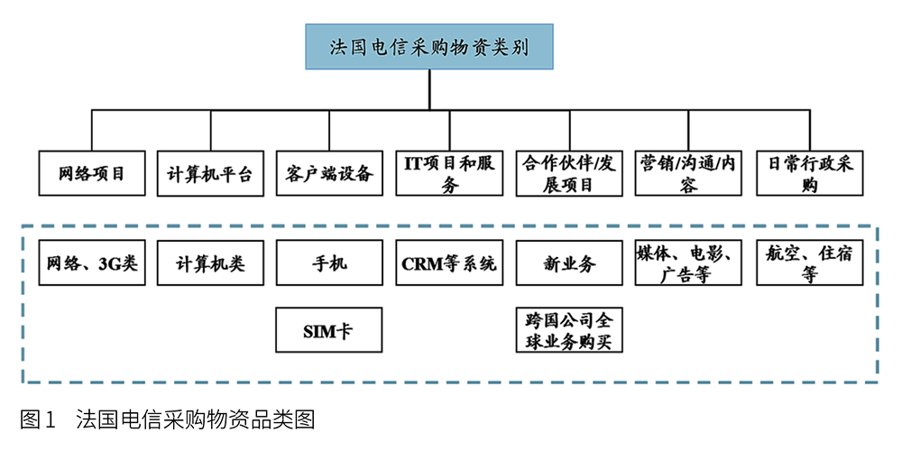 國(guó)際運(yùn)營(yíng)商通常以產(chǎn)品特性為出發(fā)點(diǎn),根據(jù)供應(yīng)商基礎(chǔ)及產(chǎn)品流程維度等進(jìn)行類的劃分。如法國(guó)電信將采購(gòu)物資劃分為七大領(lǐng)域共80多類(見(jiàn)圖1)。