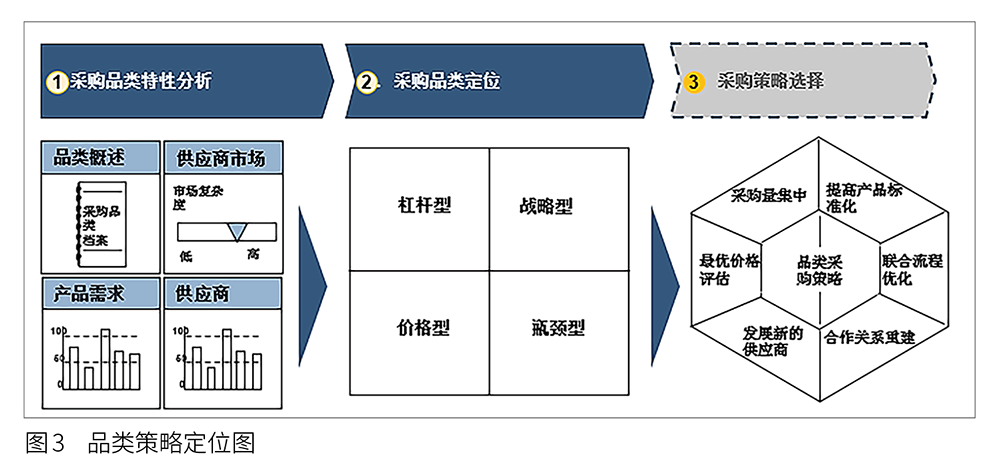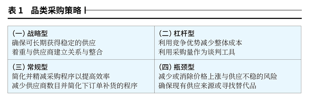 基于“卡拉杰克矩陣”進(jìn)行采購(gòu)品類定位,對(duì)“對(duì)業(yè)務(wù)的影響”以及“供應(yīng)市場(chǎng)復(fù)雜度”兩個(gè)影響因素進(jìn)行分析,形成采購(gòu)策略定位矩陣(見(jiàn)圖3)。