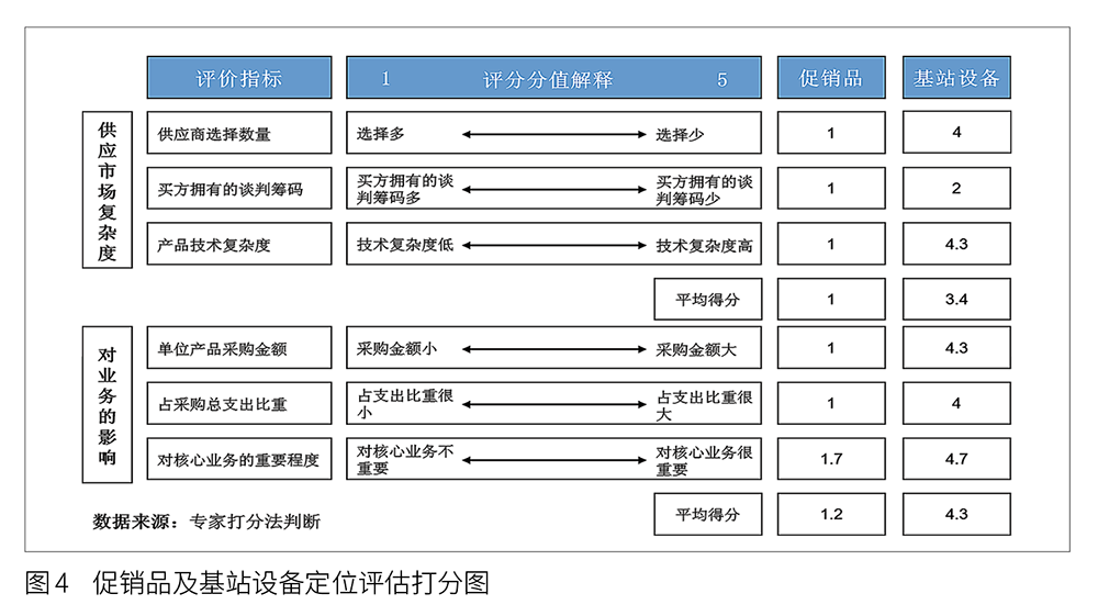 構(gòu)建評(píng)估打分表,從上述兩個(gè)維度量化供應(yīng)市場(chǎng)復(fù)雜度和業(yè)務(wù)影響度。以促銷品和基站設(shè)備為例,分析市場(chǎng)復(fù)雜度和對(duì)業(yè)務(wù)影響度,評(píng)價(jià)結(jié)果如圖4所示。