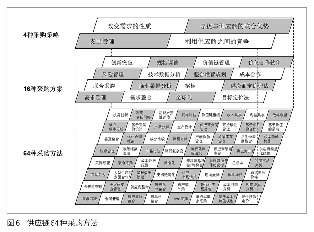 通過(guò)供方和需求方的力量對(duì)比,判斷基本的采購(gòu)策略,根據(jù)采購(gòu)策略中的基本策略對(duì)應(yīng)16種采購(gòu)方案以及64種采購(gòu)方法,如圖6所示。