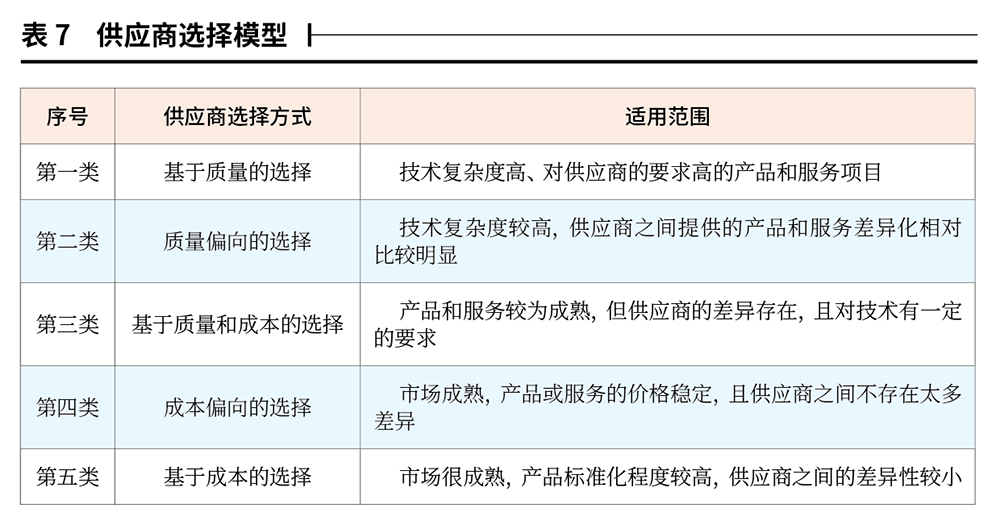 在此基礎(chǔ)上建立五類供應(yīng)商選擇模型,不同物資的招標(biāo)投標(biāo)關(guān)注點(diǎn)不同,在實(shí)際操作時(shí)應(yīng)選取對(duì)應(yīng)的供應(yīng)商選擇方式,如表7所示。