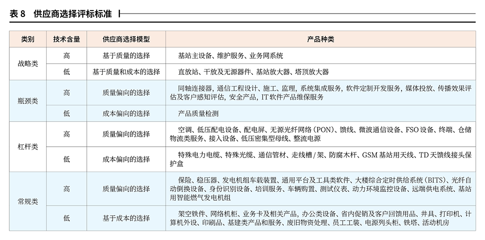 本文在借鑒國(guó)外經(jīng)驗(yàn)的基礎(chǔ)上,結(jié)合中國(guó)移動(dòng)的實(shí)際情況,基于“卡拉杰克矩陣”進(jìn)行采購(gòu)品類定位,構(gòu)建了全生命周期品類管理模型,制定了16種采購(gòu)方案以及64種采購(gòu)方法,建立了4類供應(yīng)商選擇評(píng)標(biāo)標(biāo)準(zhǔn),為提升集中采購(gòu)質(zhì)量、打造高質(zhì)量的數(shù)字化供應(yīng)鏈管理體系奠定了基礎(chǔ)。