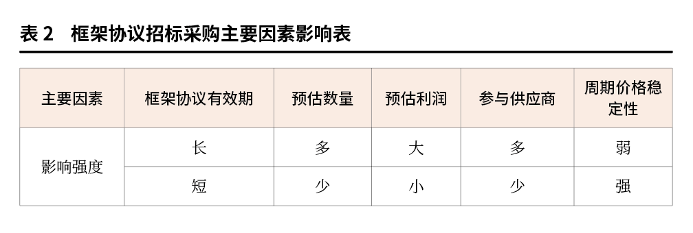 影響框架協(xié)議招標(biāo)采購的因素很多,主要包括框架協(xié)議有效期、預(yù)估數(shù)量、預(yù)估利潤和周期價格浮動等(見表2)。因?qū)嵤┎少彆r交貨時間、交貨地點、供貨數(shù)量等主要采購要素不確定,致使供應(yīng)商在參與投標(biāo)競價時無法針對真實的項目情況對自身生產(chǎn)能力、資金壓力、相應(yīng)風(fēng)險進行預(yù)估和判斷,間接使得報價也相對保守,達不到預(yù)期效果。