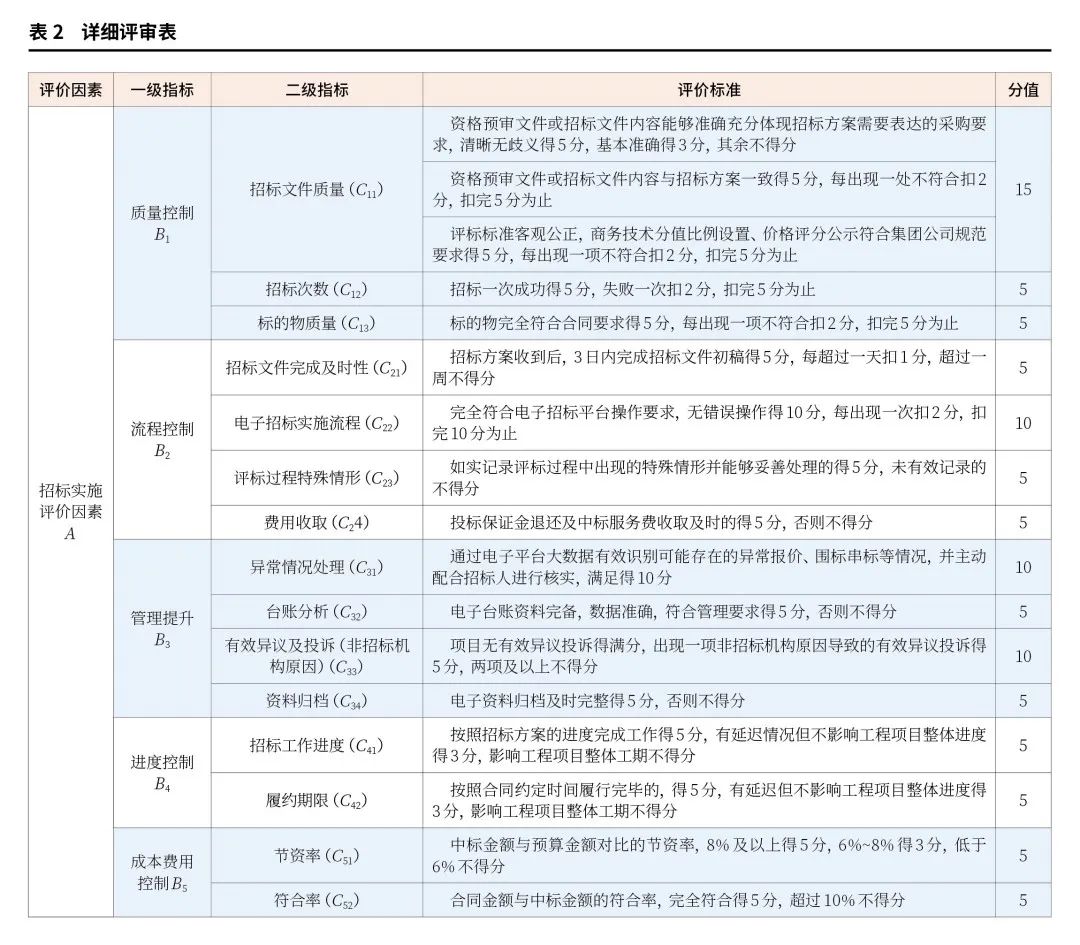 以提質(zhì)增效總目標為導向,綜合考慮強化合規(guī)管理、本單位招標業(yè)務部門考核指標等因素,共設計了5個一級指標,分別為質(zhì)量控制、流程控制、管理提升、進度控制、成本費用控制五個方面。其中,質(zhì)量控制分為招標文件質(zhì)量、招標次數(shù)、標的物質(zhì)量3個二級指標;流程控制分為招標文件完成及時性、電子招標實施流程、評標過程特殊情形、費用收取4個二級指標;管理提升分為異常情況識別、臺賬分析、有效異議及投訴(非招標機構(gòu)原因)、資料歸檔4個二級指標;進度控制分為招標工作進度、履約期限2個二級指標;成本費用控制分為節(jié)資率、符合率2個二級指標。根據(jù)以上評價指標,詳細評審細則見表2。